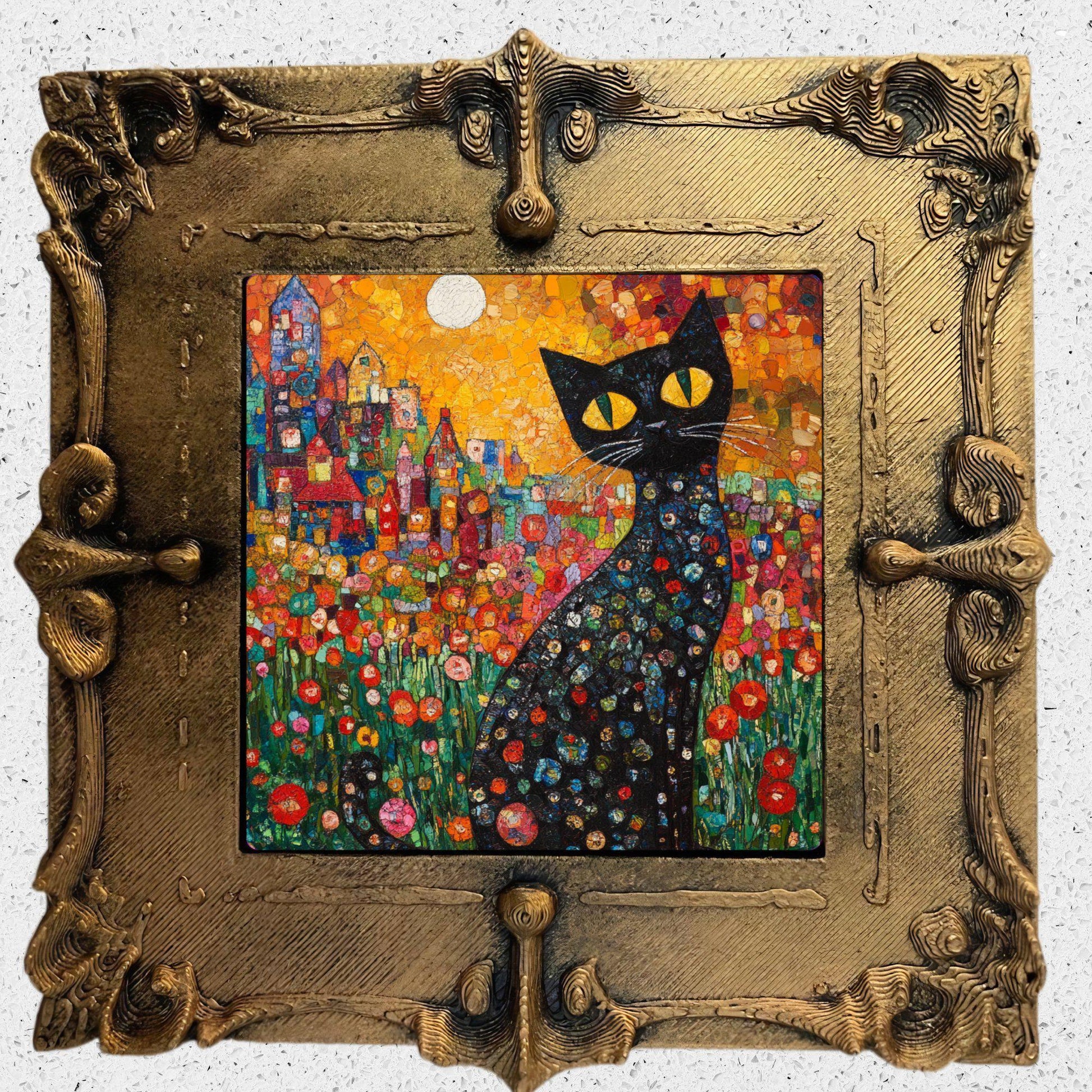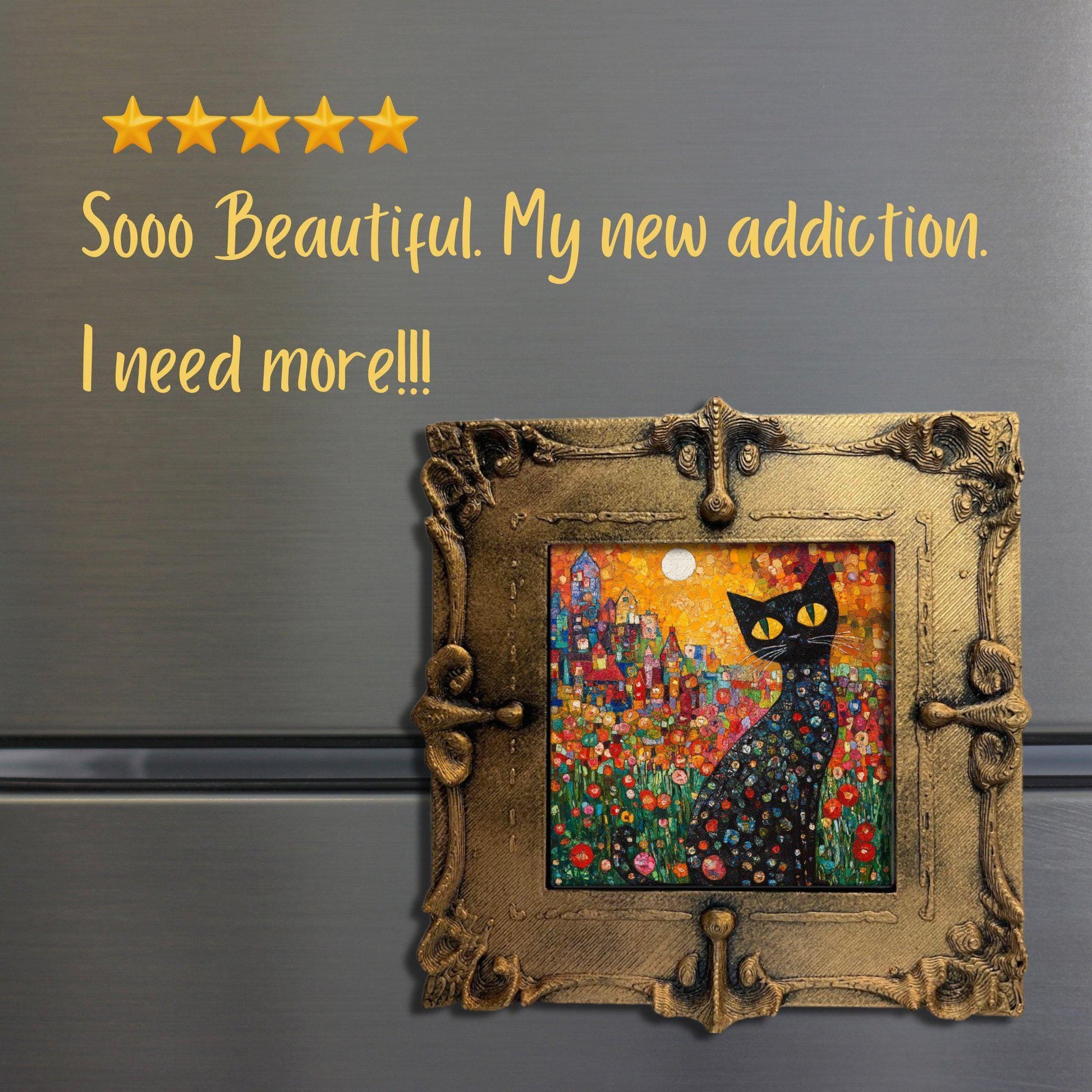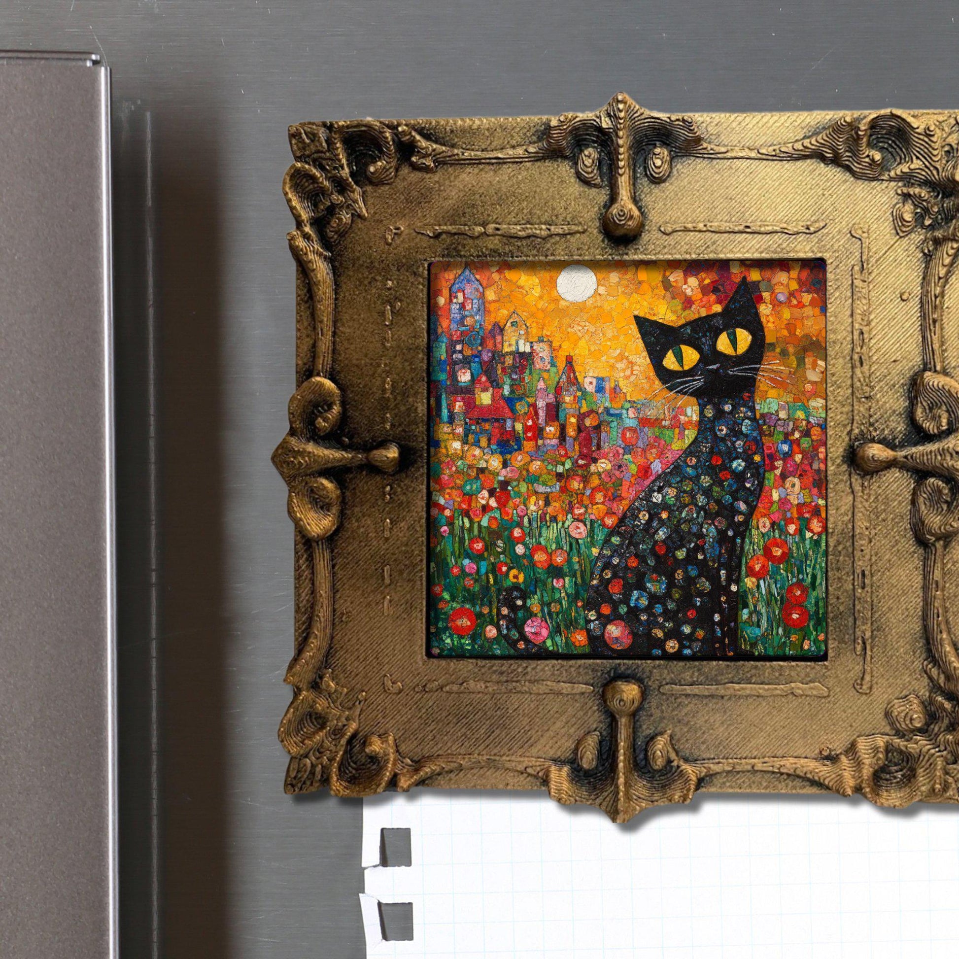 Garden Cat Klimt Style Gold Framed Refrigerator Magnet, Mini Art, Grand Millennial Style, Artful Kitchen Decor, Gift for Her fridgescaping