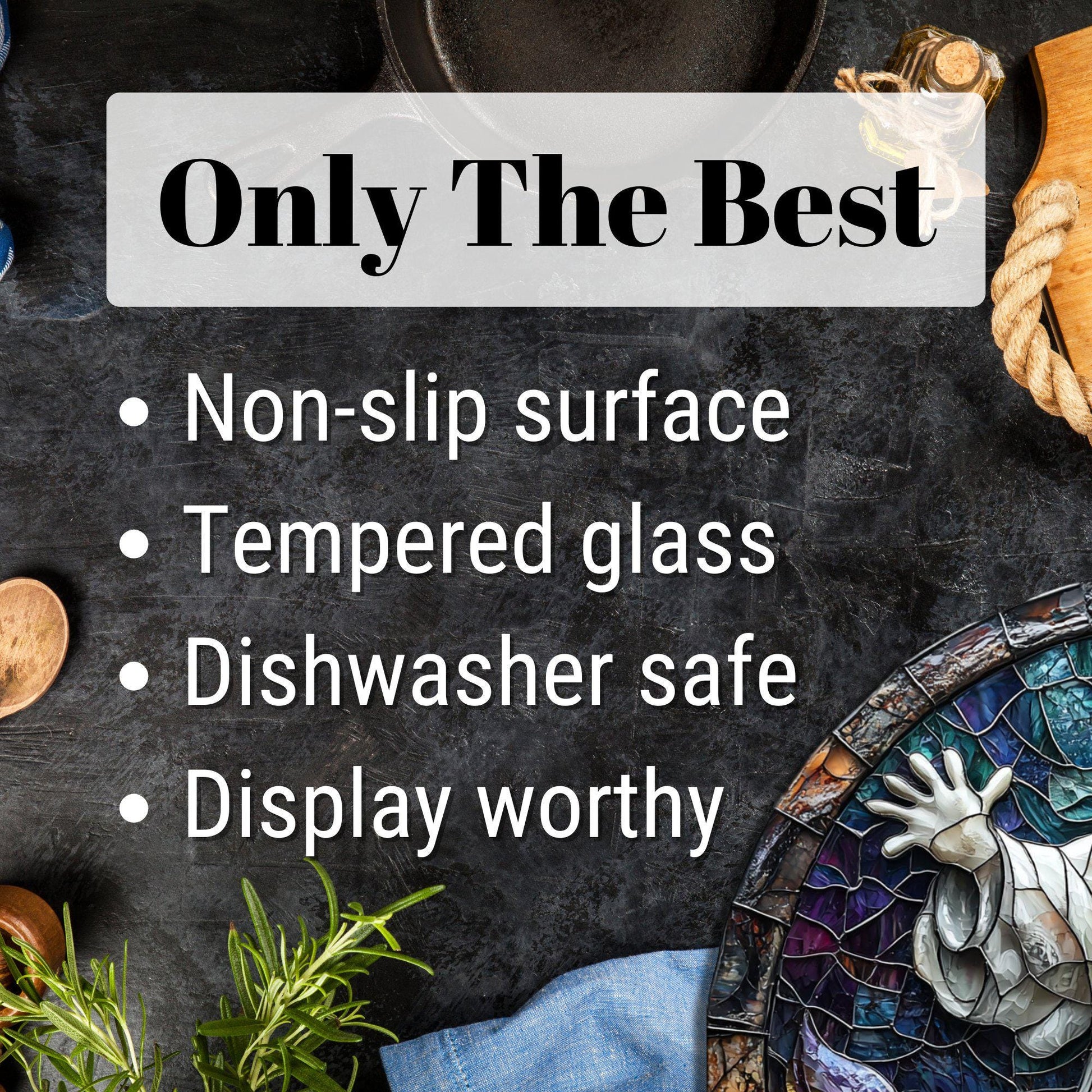 Our 8-inch Circle Glass Cutting Board is a versatile and elegant addition to any kitchen or dining area. Crafted from durable texture glass, this multi-functional piece is designed to be both practical and visually stunning. Key Features: - 8-inch circular design, perfect for various kitchen tasks - Made from high-quality tempered, textured glass for durability and aesthetic appeal - Dishwasher safe for easy cleaning - Anti-slip feet on the back side to keep the board in place and protect surfaces - Adorned with beautiful artwork to enhance your kitchen decor Versatile Uses: - Cutting Board: Ideal for chopping and slicing ingredients - Trivet: Protects your surfaces from hot dishes - Charcuterie Board: Perfect for serving appetizers and snacks - Display Piece: Can be showcased vertically in a display cabinet or on a counter The perfect gift for various occasions and recipients: - Her - Wife - Mom - Grandmother - Housewarming Gift - Hostess Gift Elevate your kitchen with this functional and beautiful glass cutting board that seamlessly blends practicality with artistry. We make each piece to order in our small family workshop in East Tennessee in the foothills of the Smoky Mountains. Thank you so much for supporting our family business - it means so much to us and we love creating art that you will enjoy in your home for years to come. We love custom requests! If you have an idea for piece reach out to us.