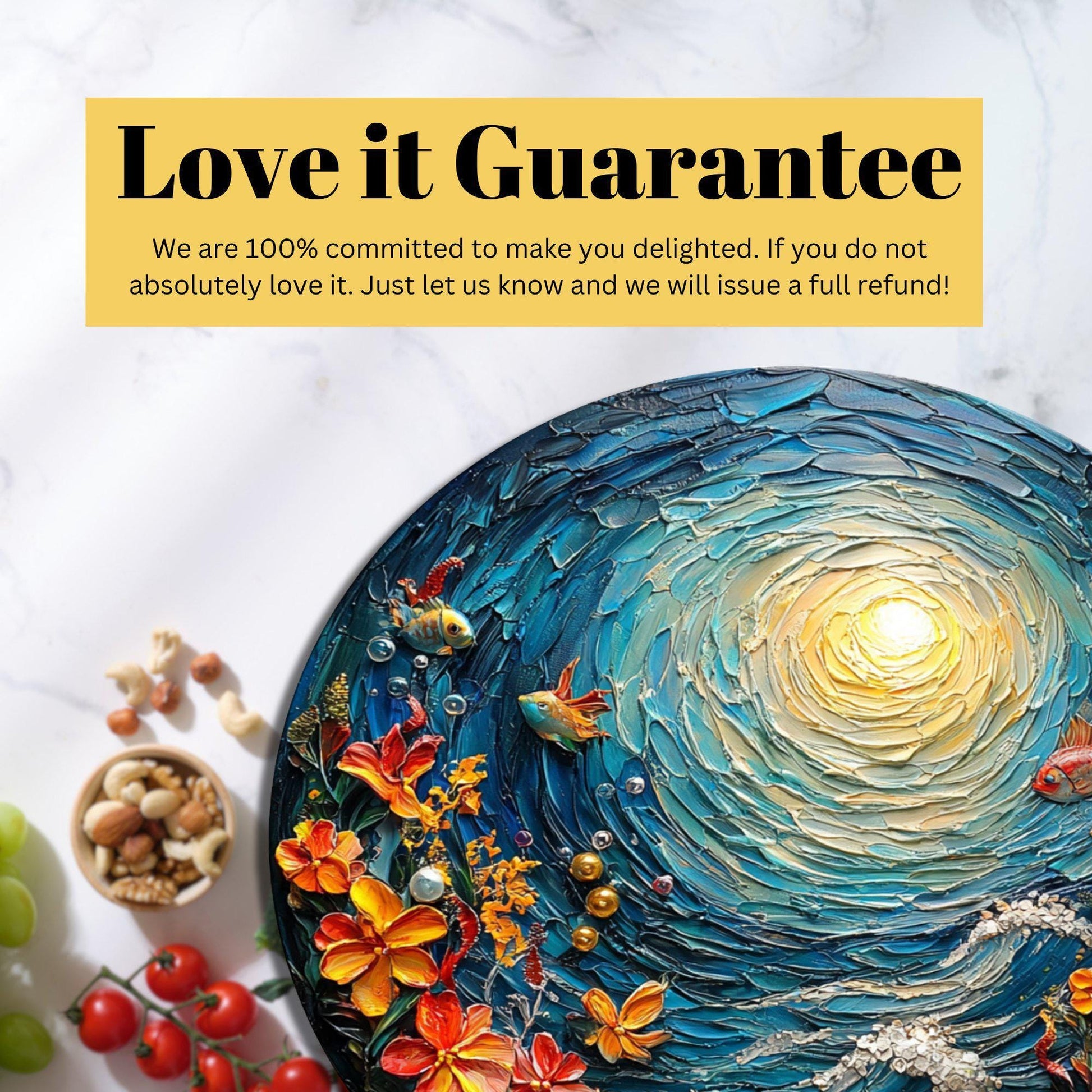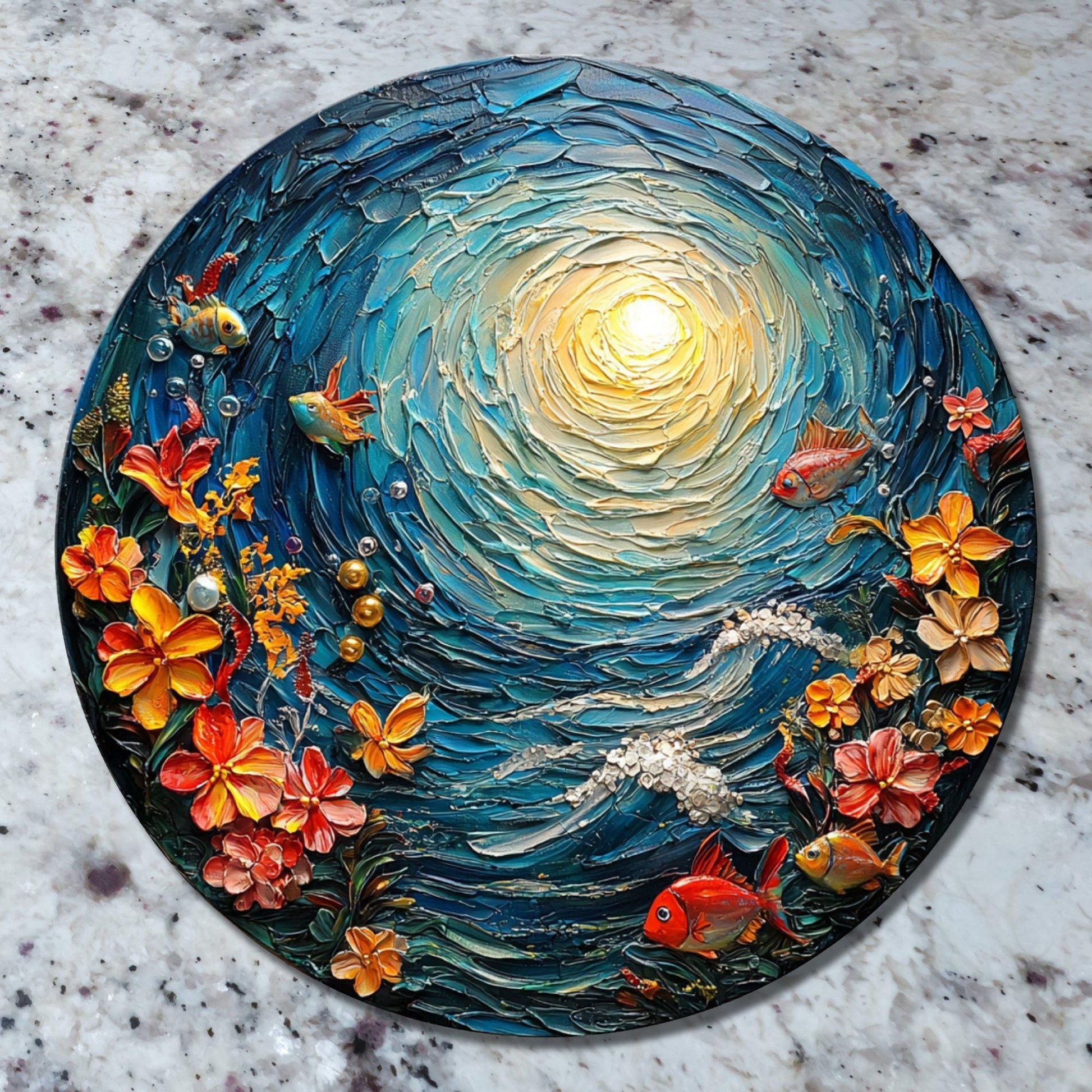 Glass Cutting Board Sunny Under the Sea Day 8-inch Round Trivet Charcuterie Board Gift for Her Mom Kitchen Decor