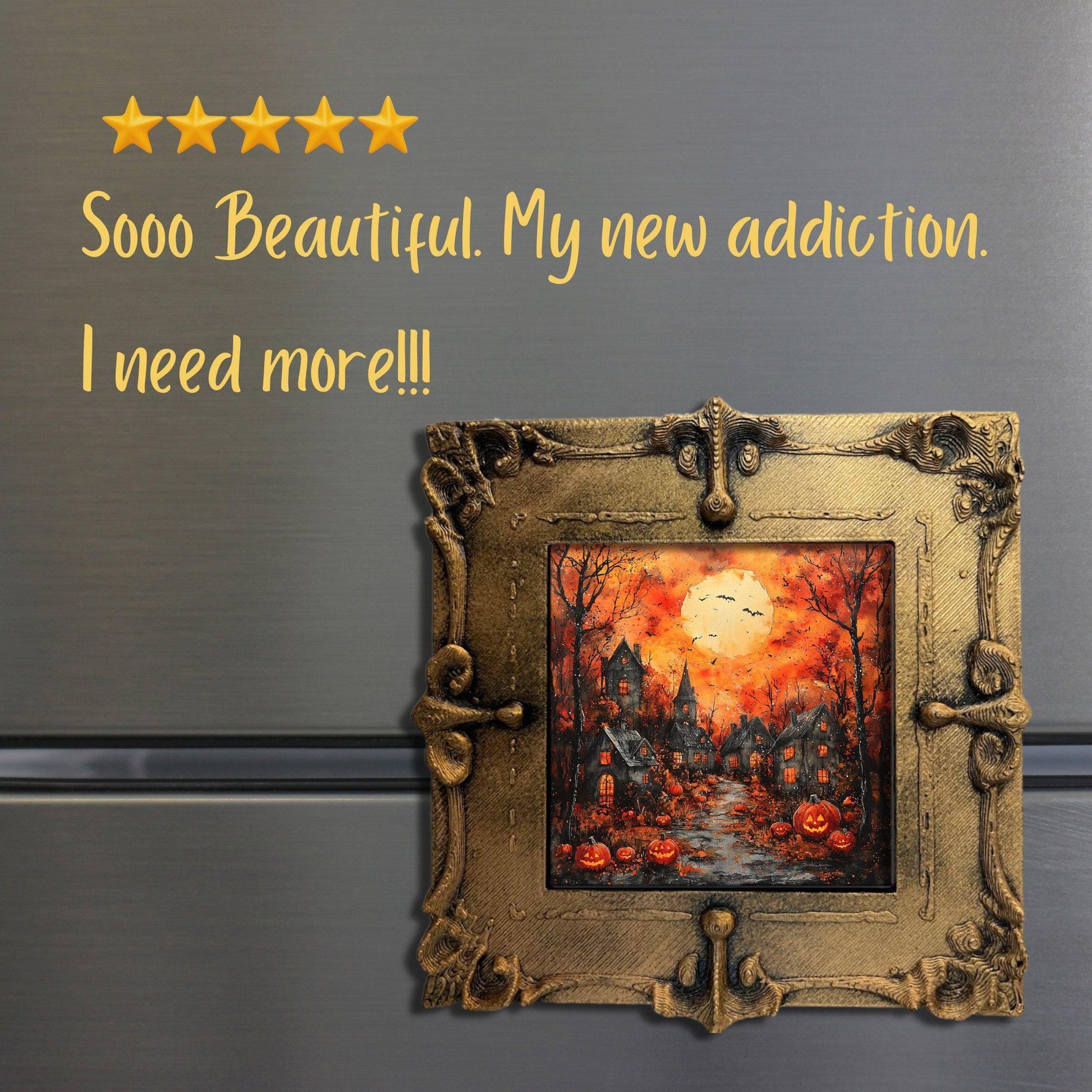 Halloween Village Gold Framed Refrigerator Magnet, Mini Art, Grand Millennial Style, Artful Kitchen Decor, Gift for Her fridgescaping