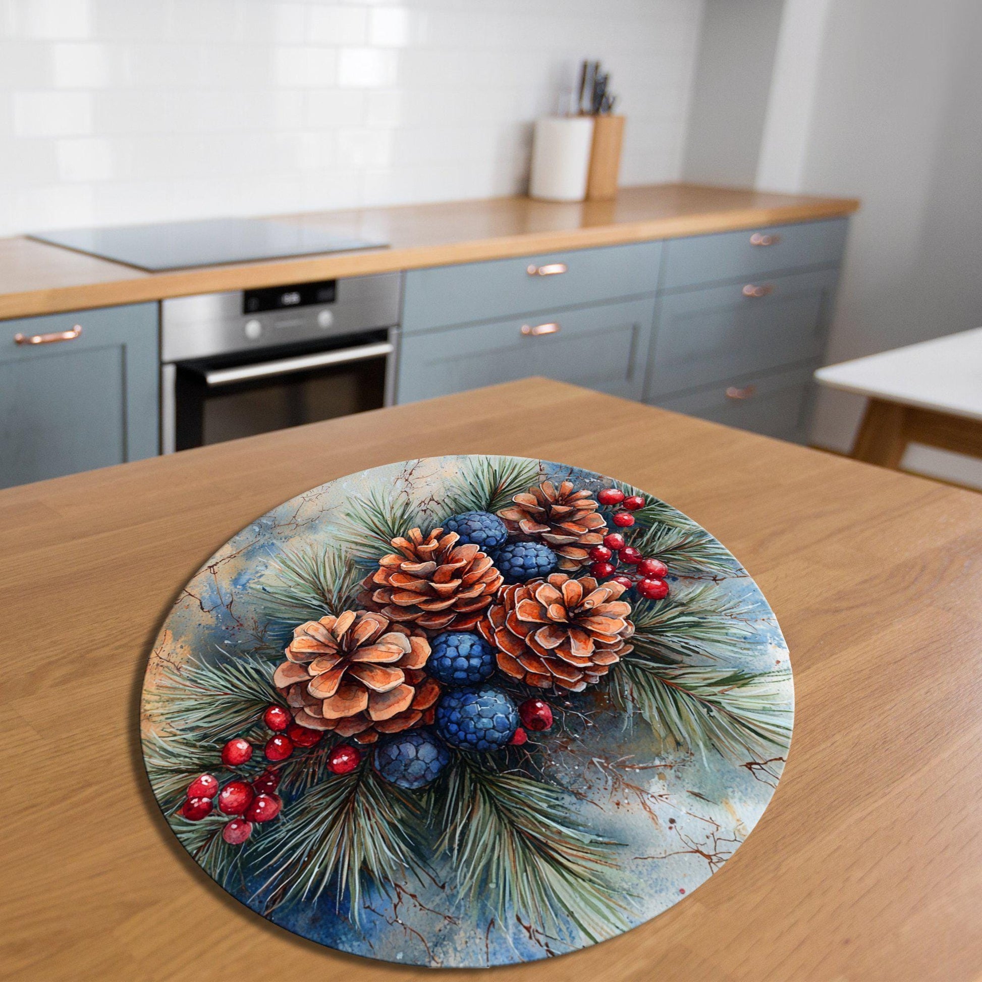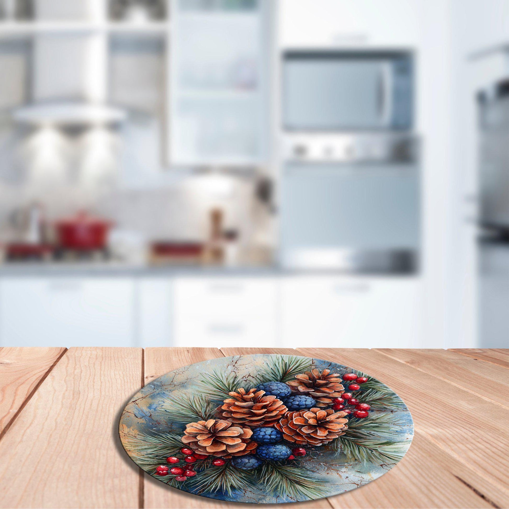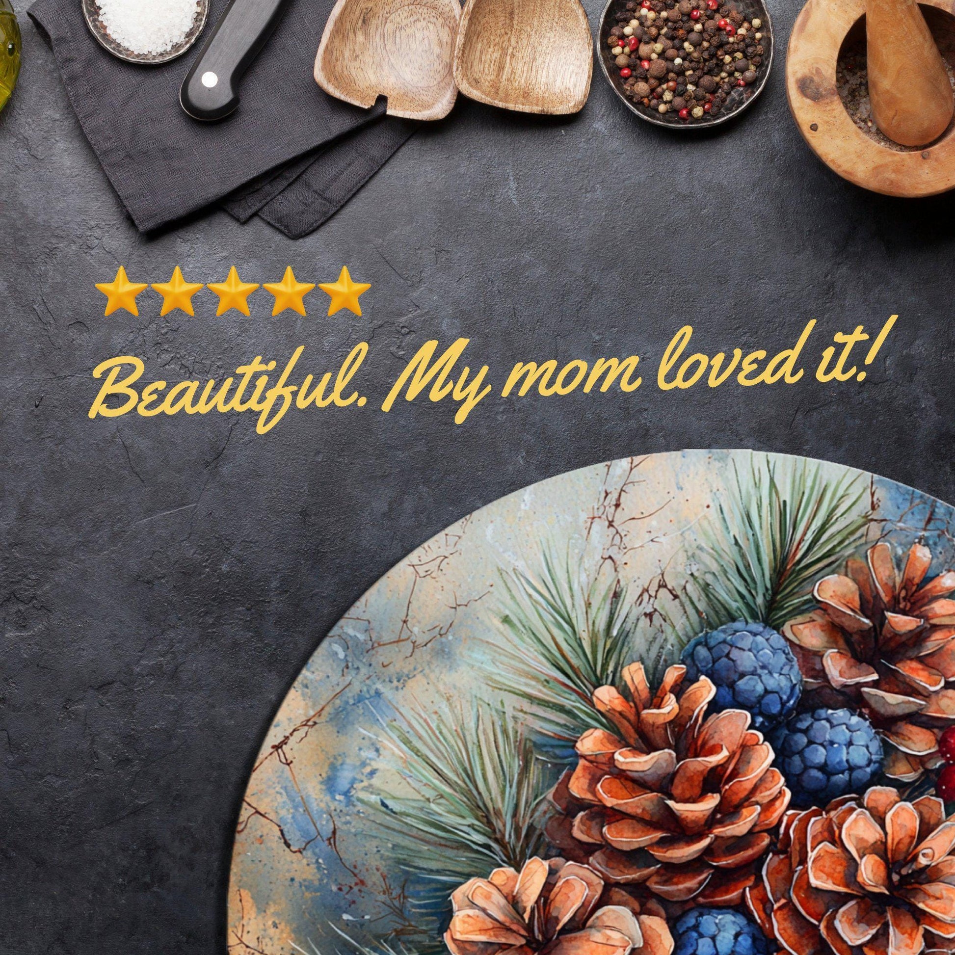 Pinecones Berries Glass Cutting Board 8-inch Round Trivet Charcuterie Board Gift for Her Mom Kitchen Decor