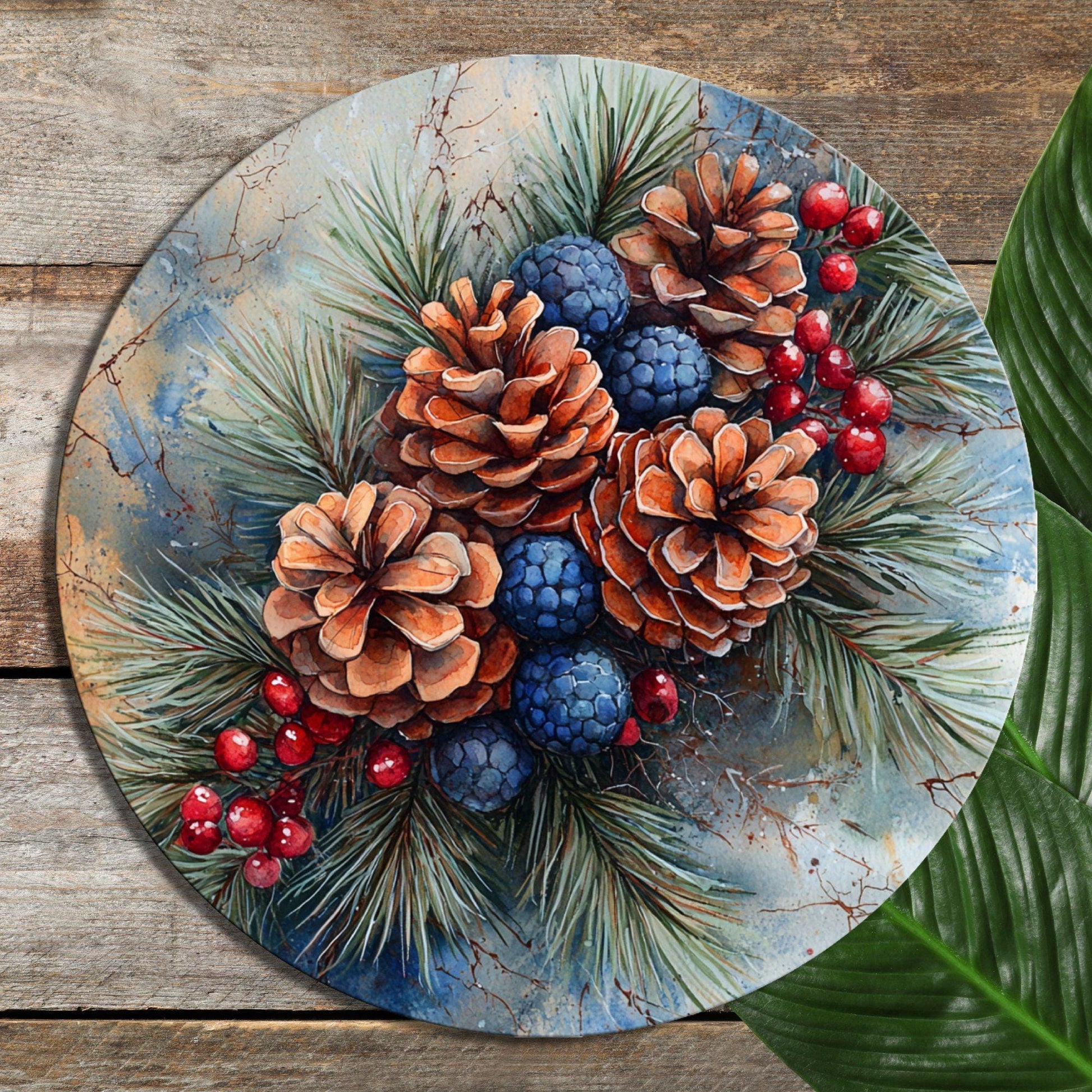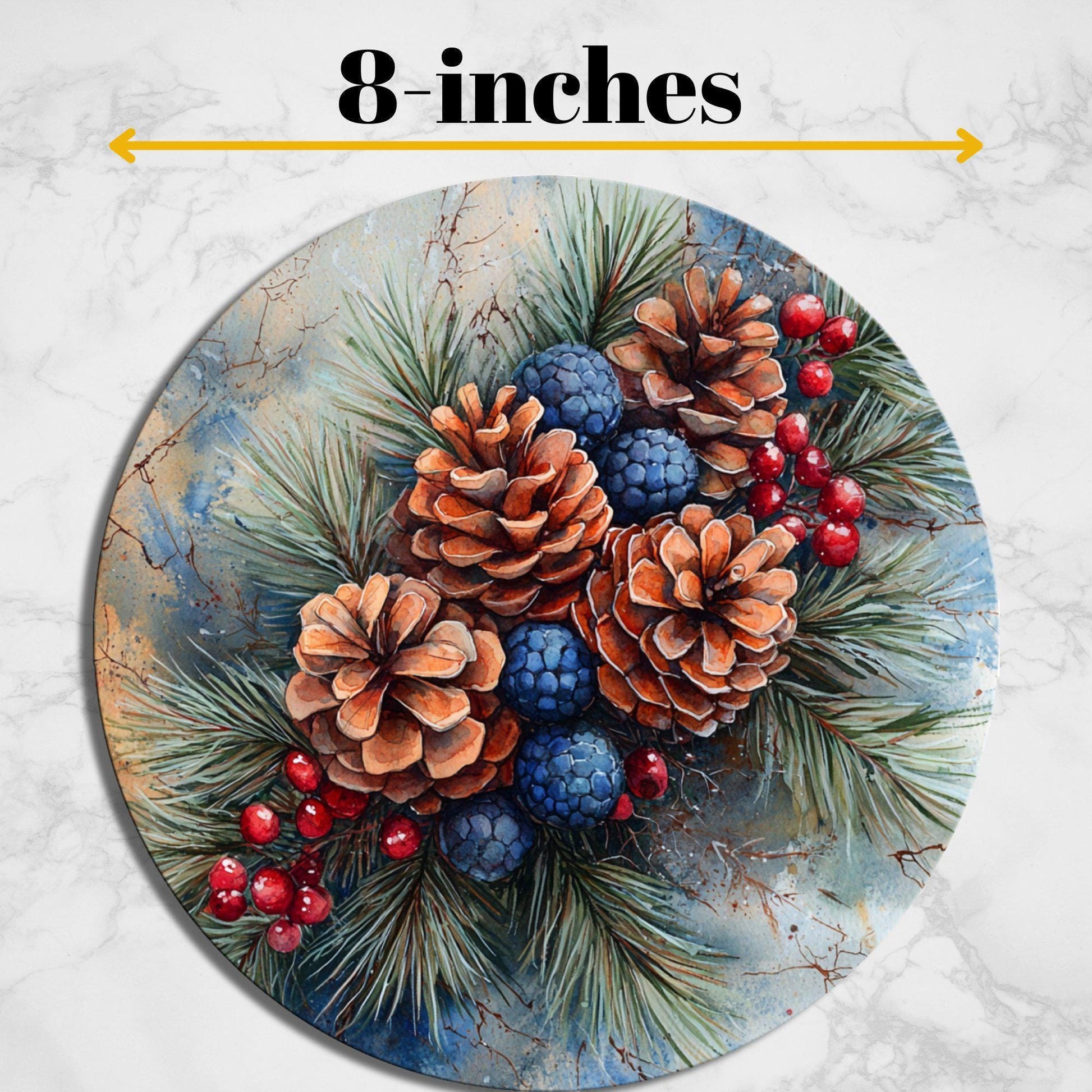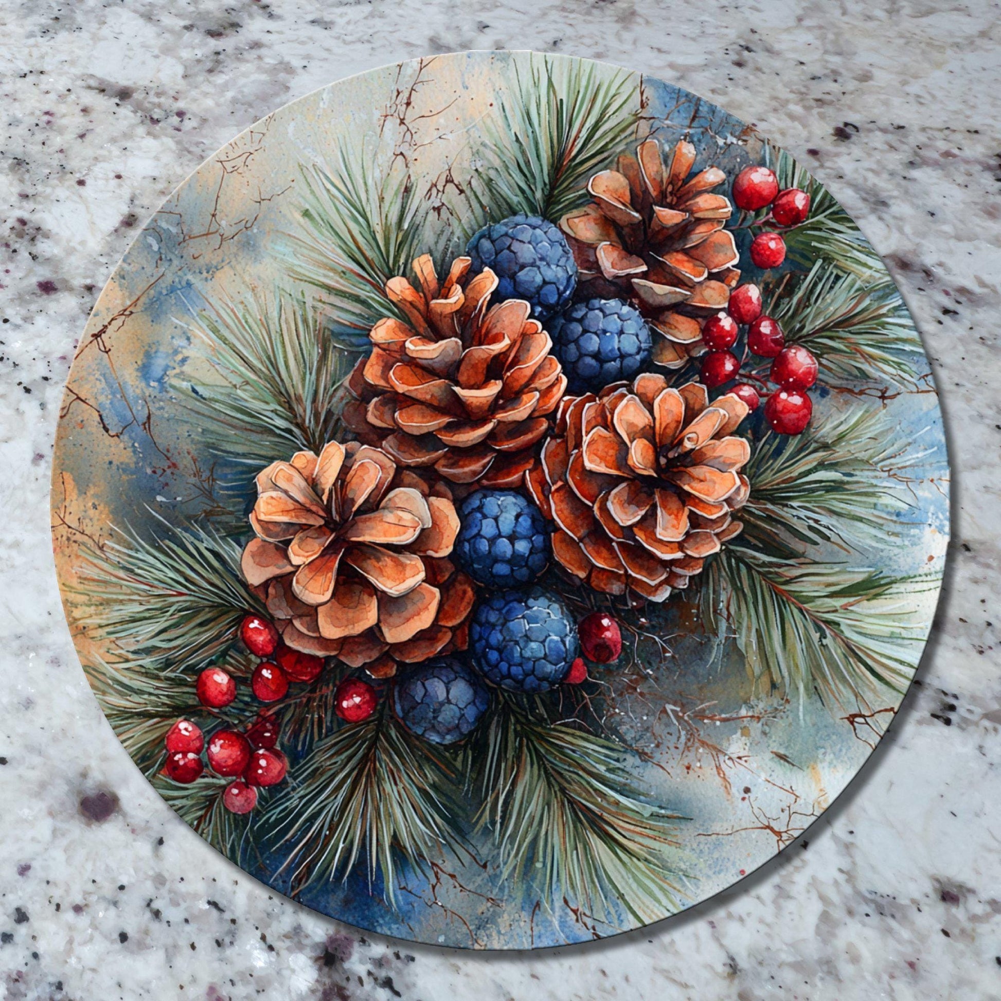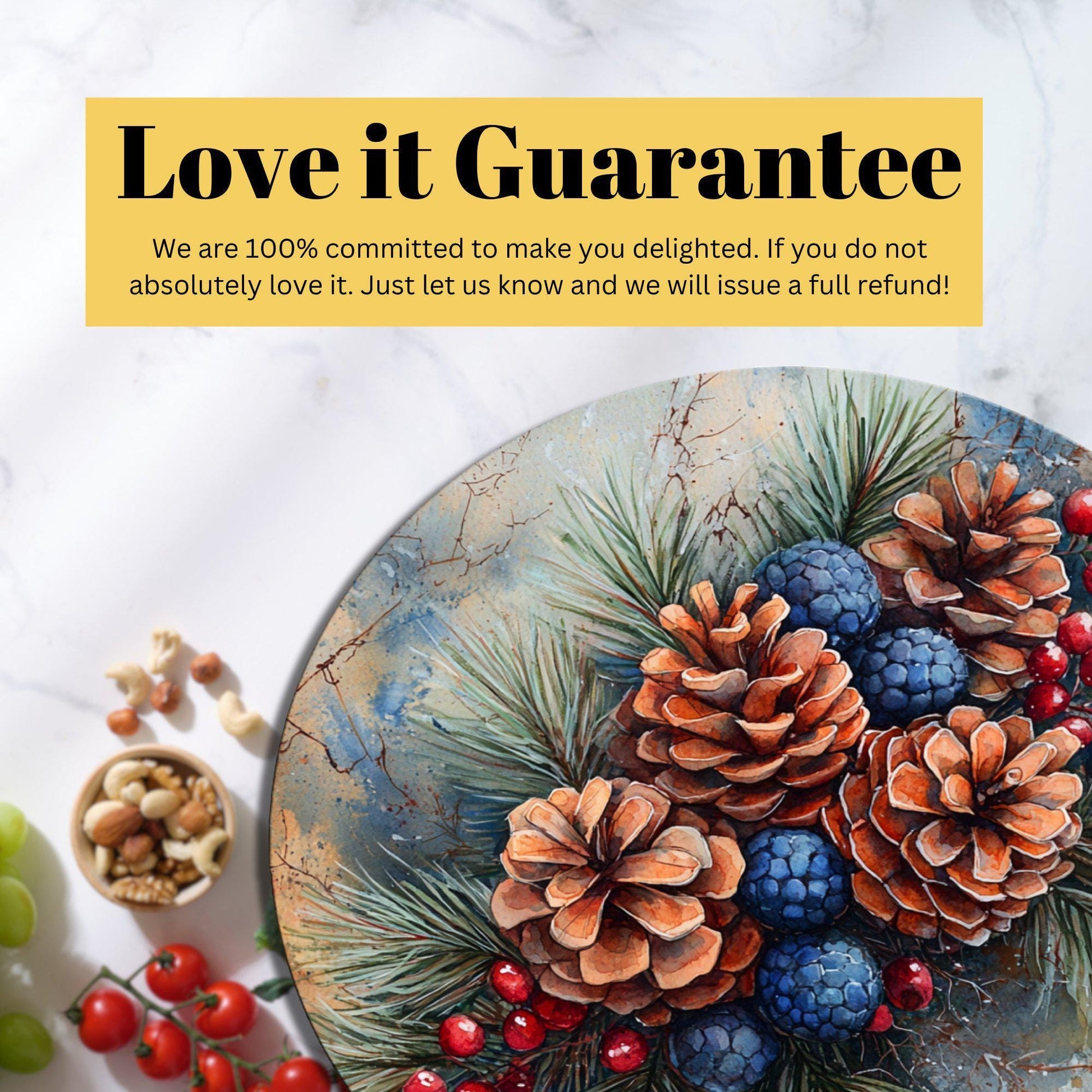 Pinecones Berries Glass Cutting Board 8-inch Round Trivet Charcuterie Board Gift for Her Mom Kitchen Decor