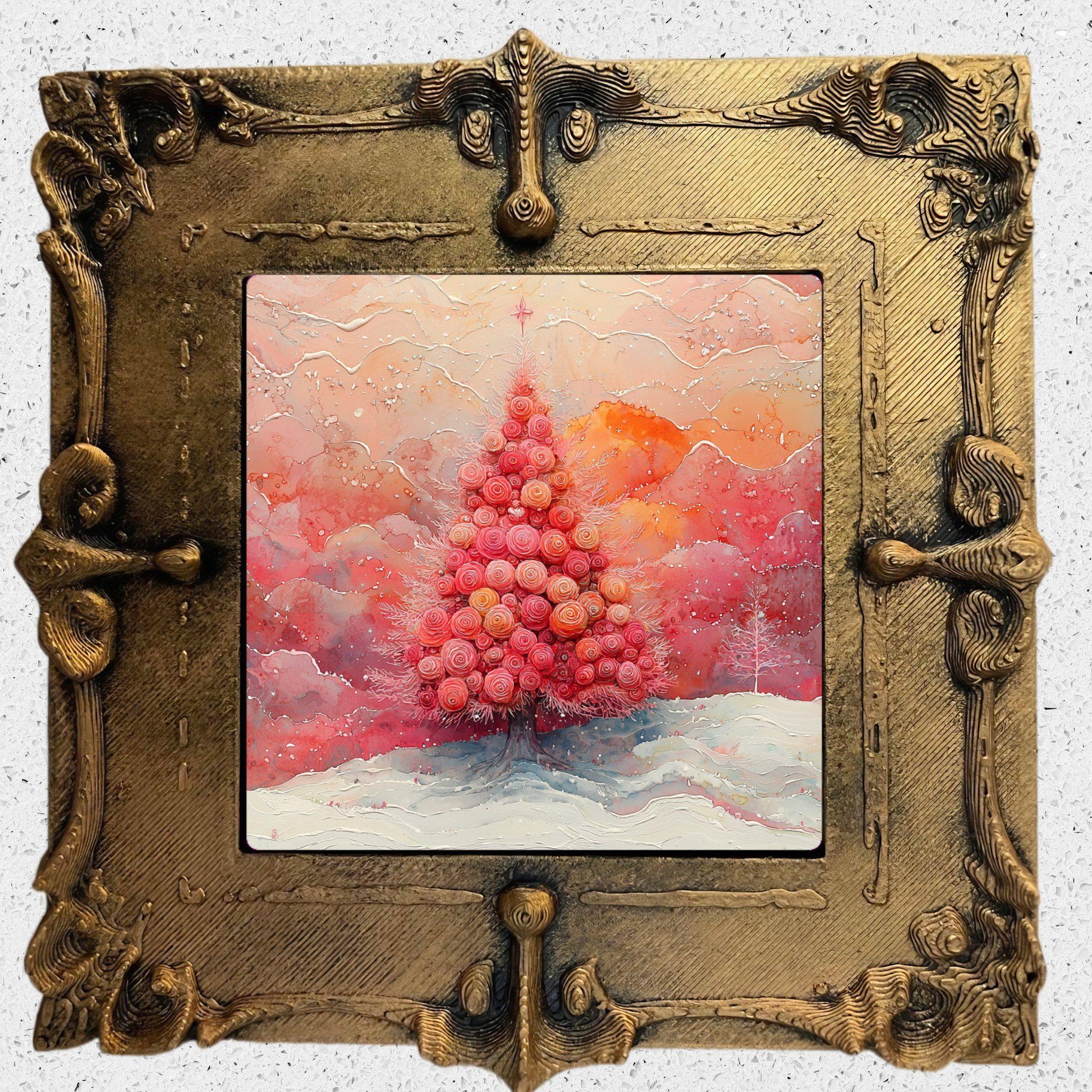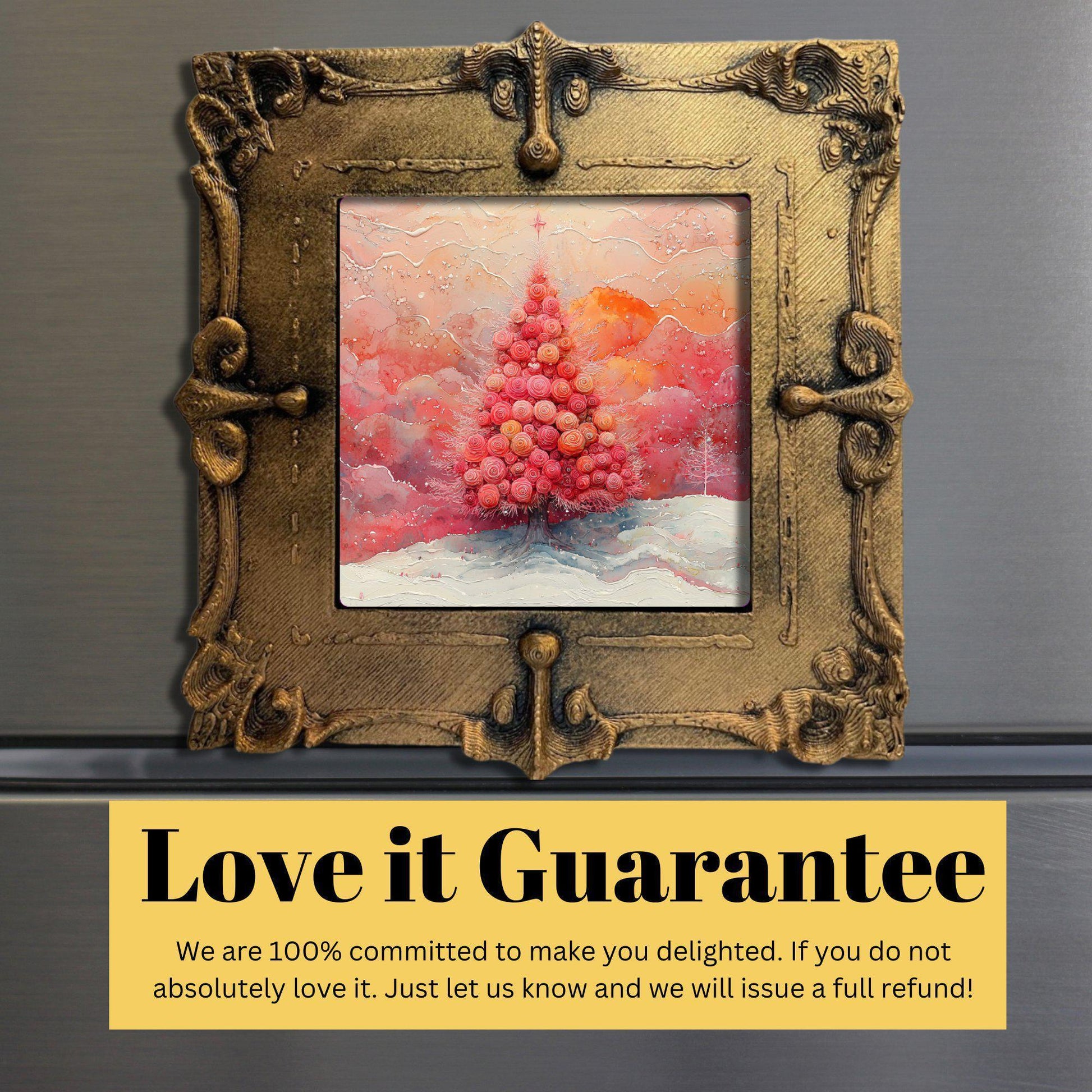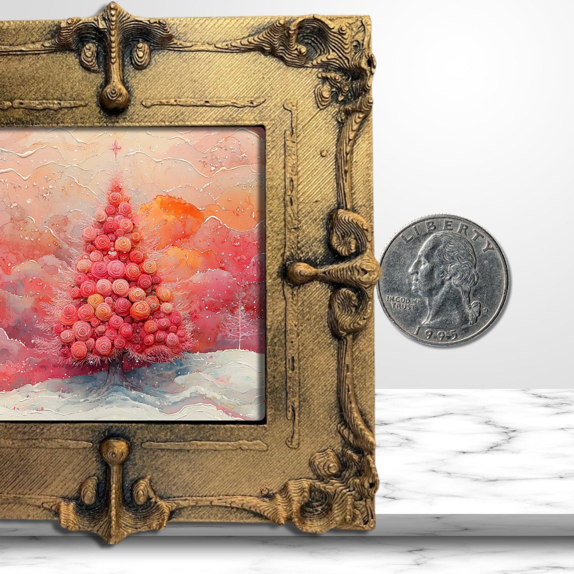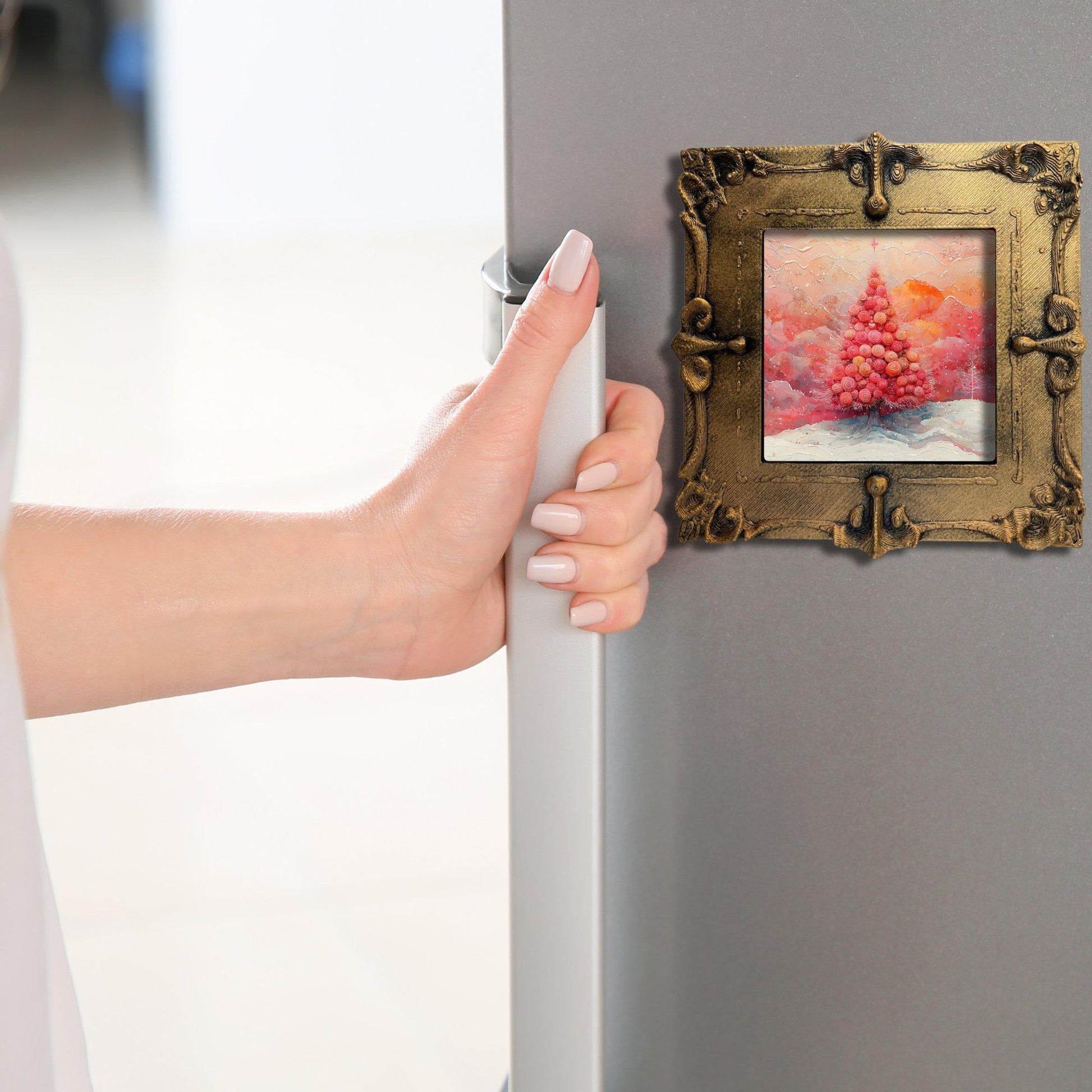 Pink Floral Christmas Tree Gold Framed Refrigerator Magnet, Mini Art, Grand Millennial Style, Artful Kitchen Decor, Gift for Her