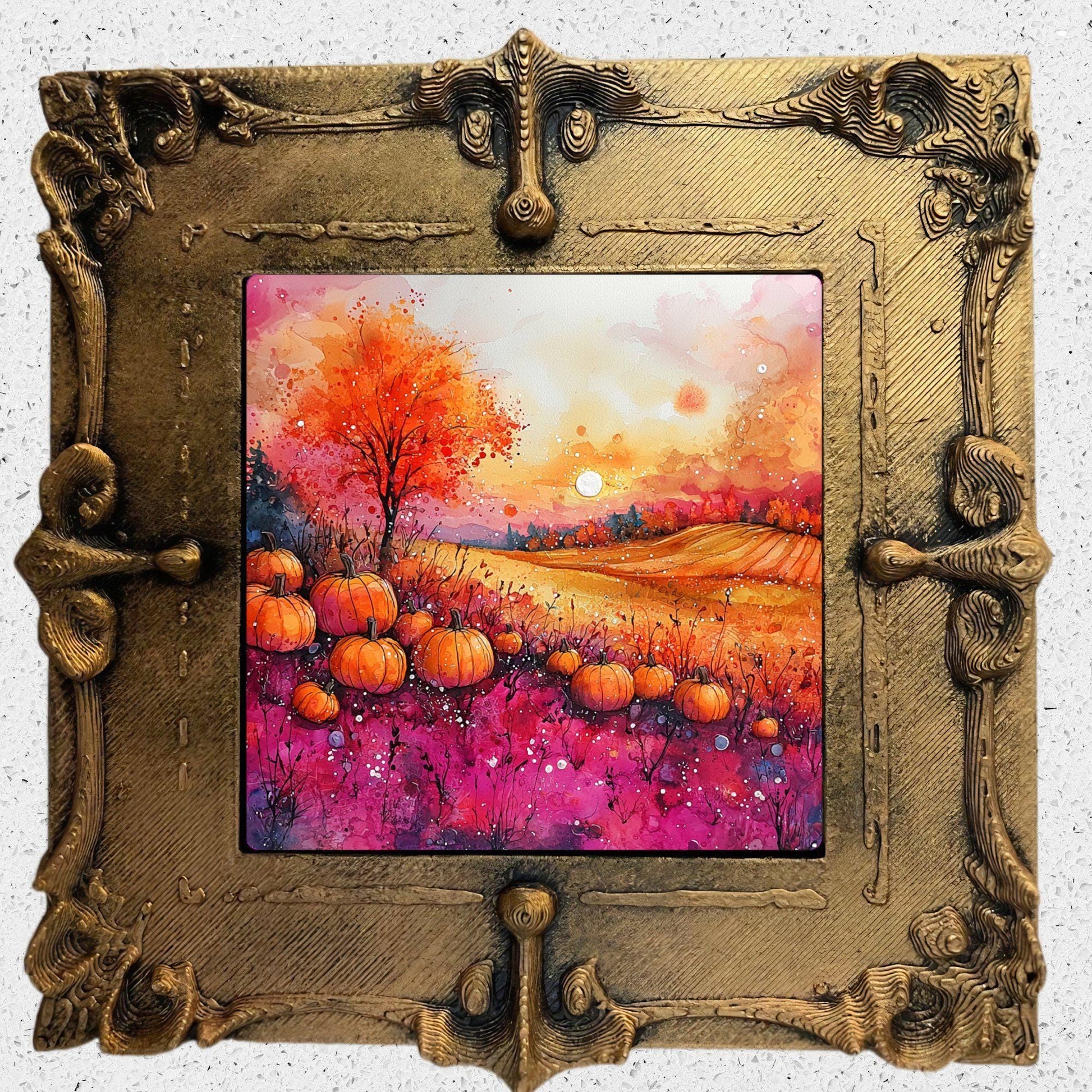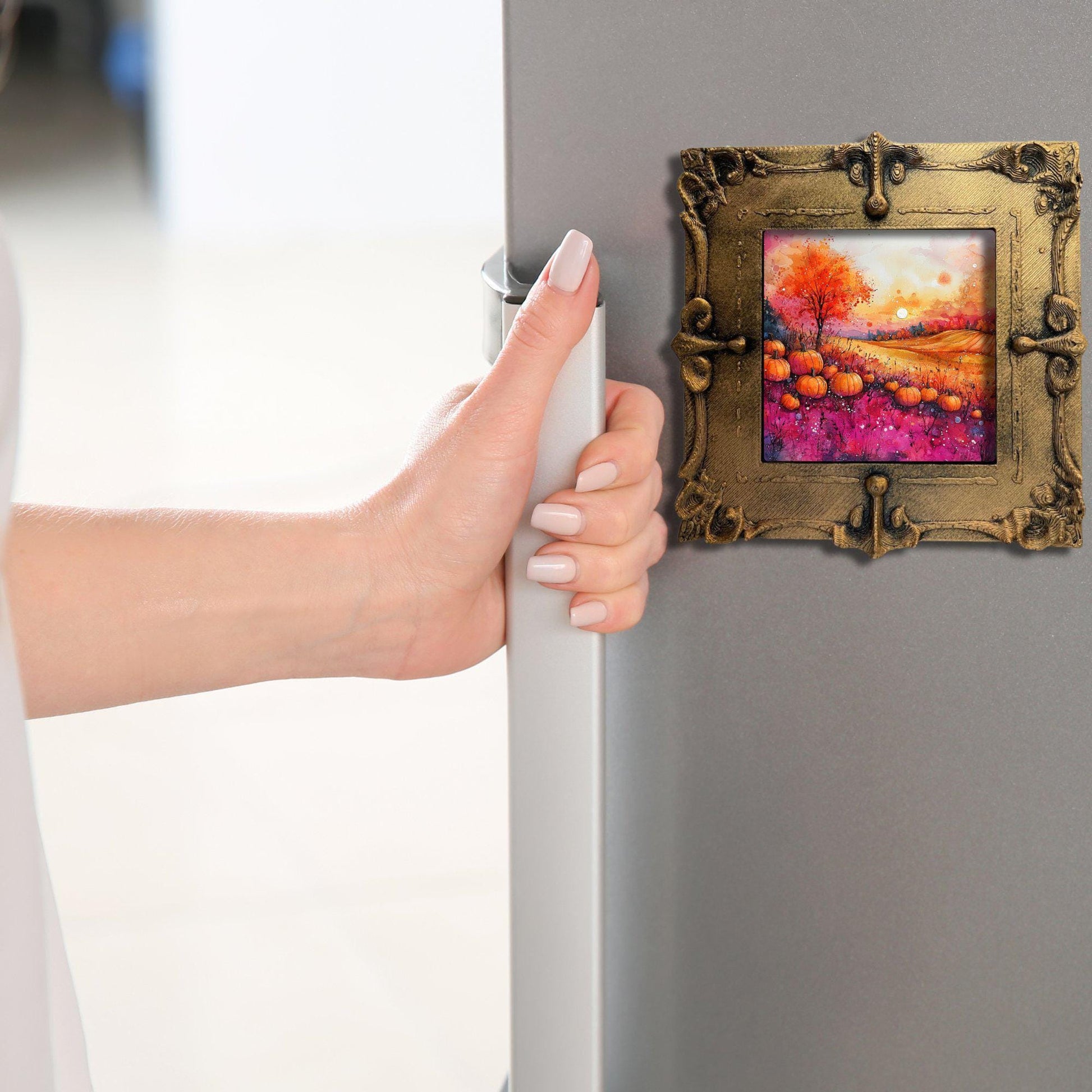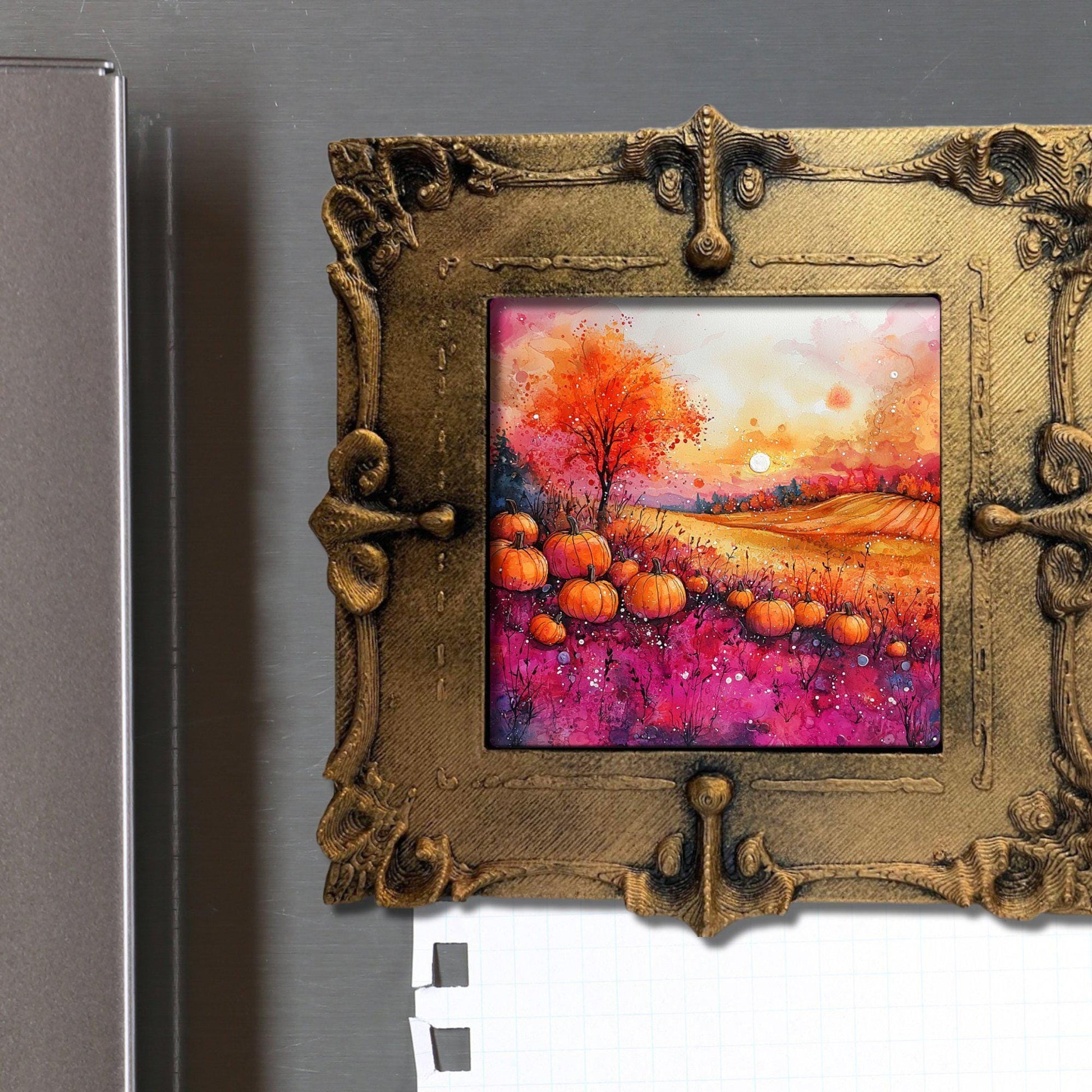 Pumpkins Pink and Orange Gold Framed Refrigerator Magnet, Mini Art, Grand Millennial Style, Artful Kitchen Decor, Gift for Her fridgescaping