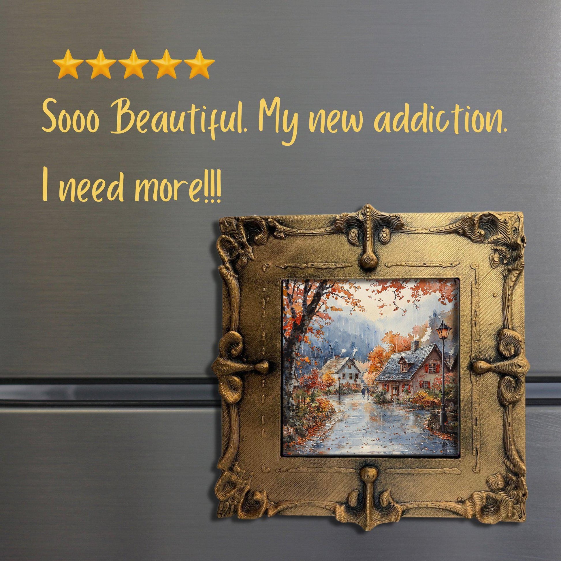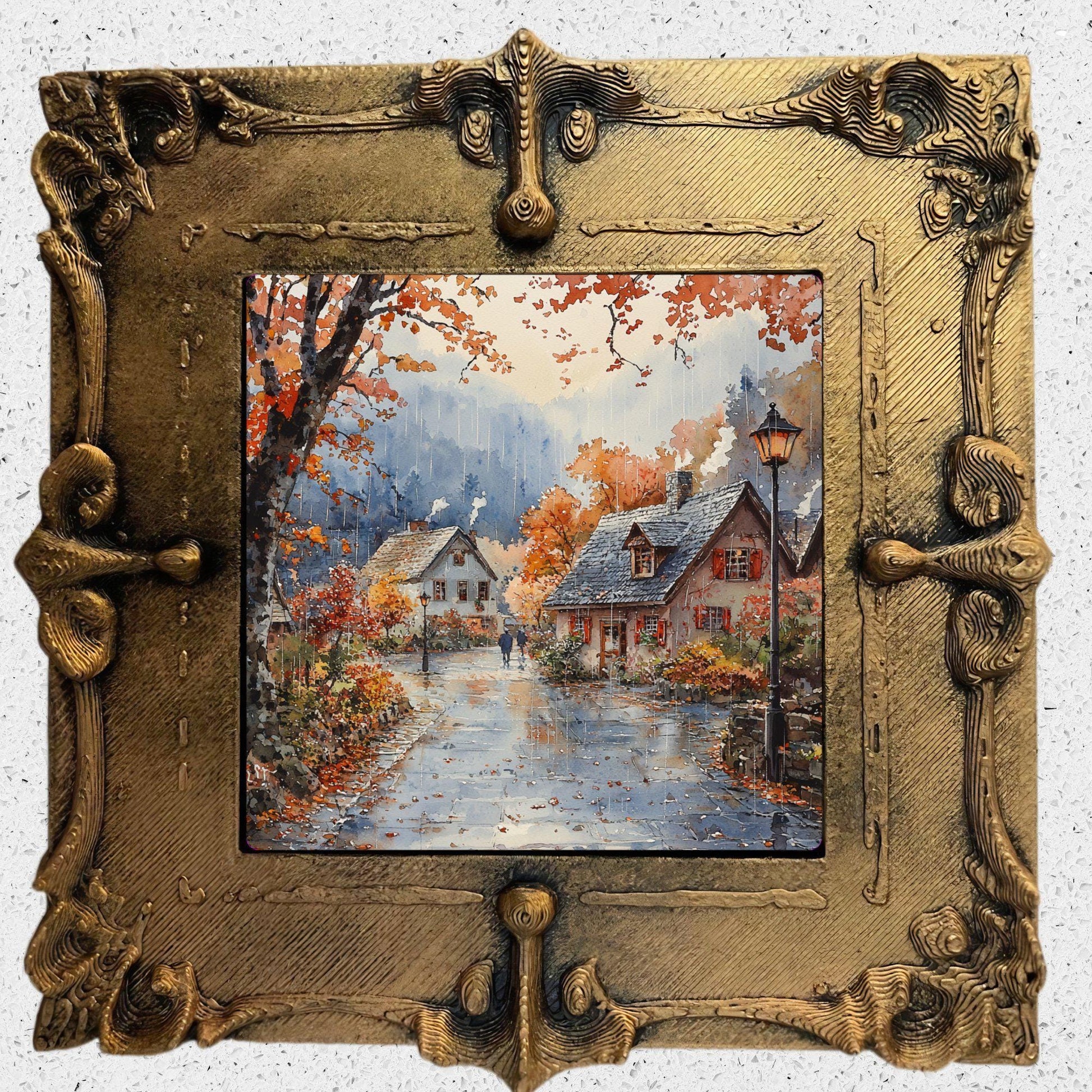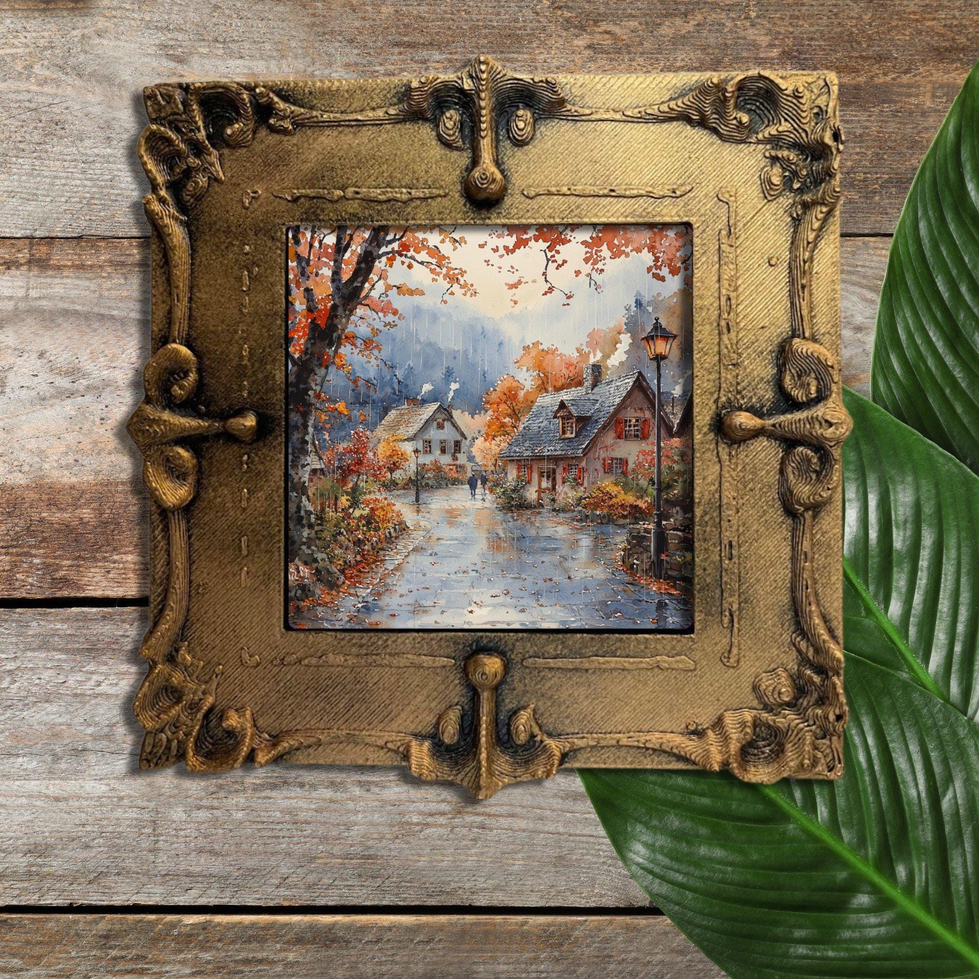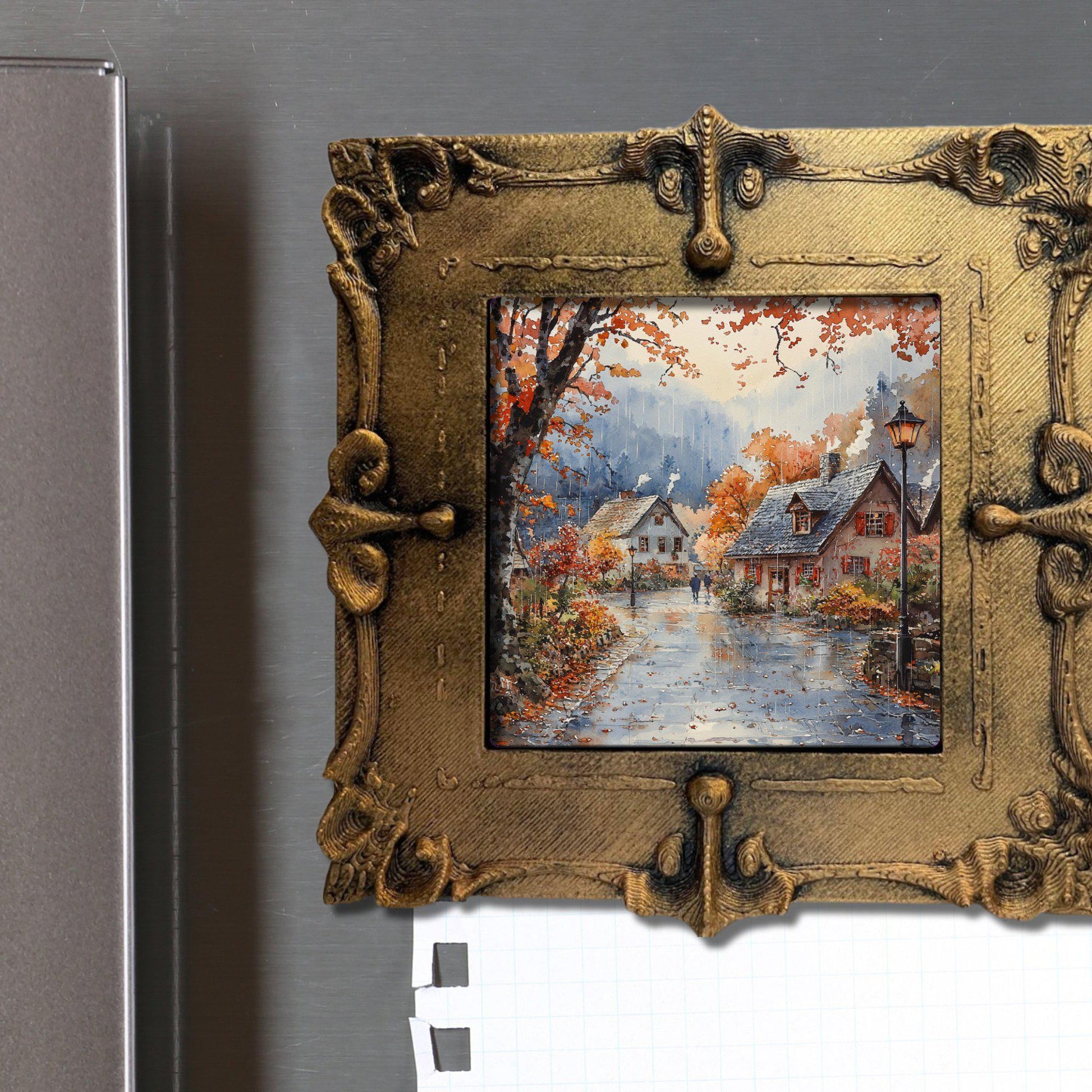 Rainy Autumn Village Gold Framed Refrigerator Magnet, Mini Art, Grand Millennial Style, Artful Kitchen Decor, Gift for Her fridgescaping