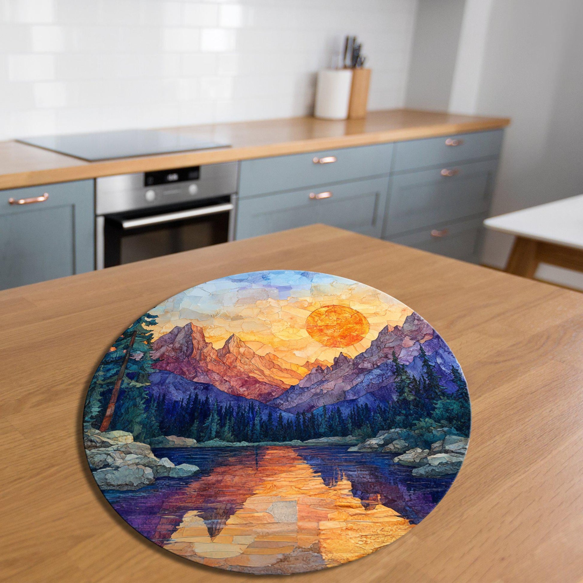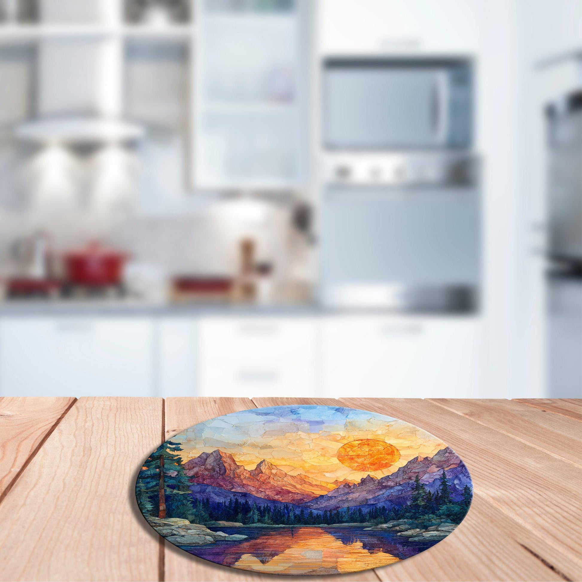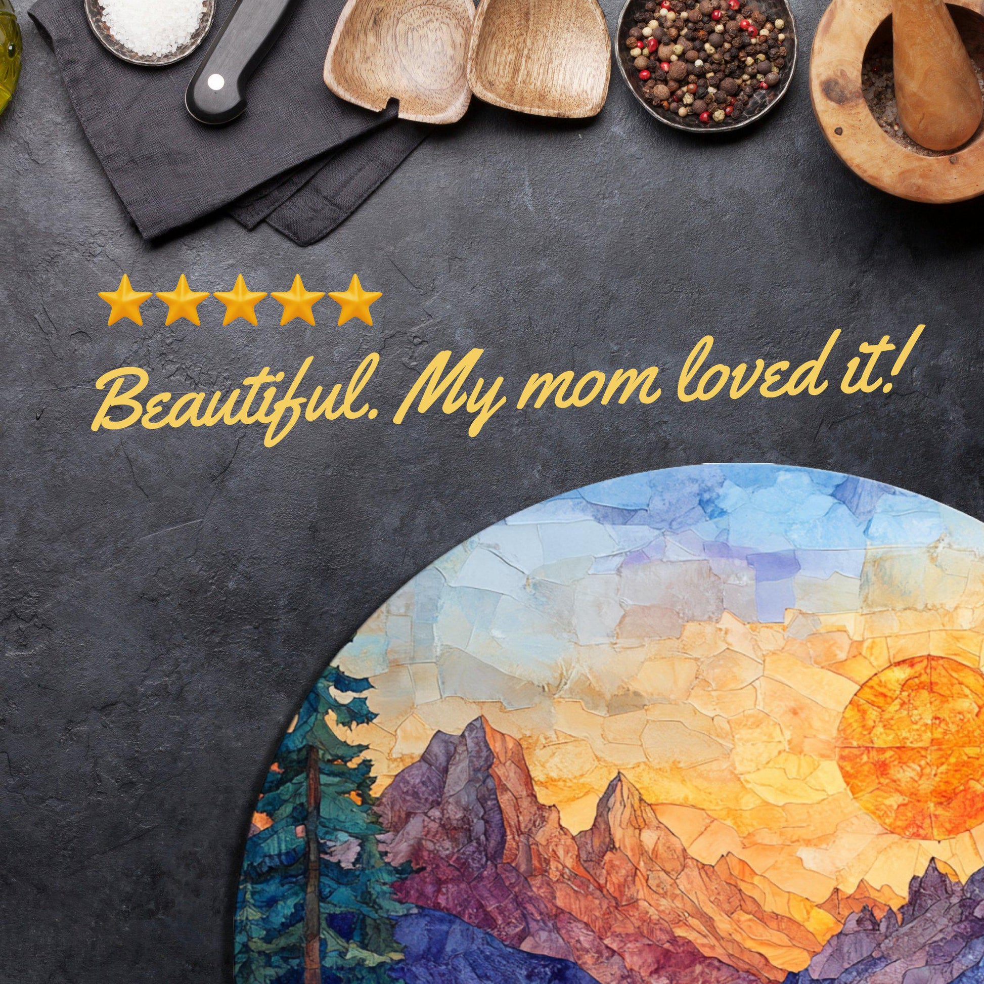Rocky Mountain Sunrise Glass Cutting Board 8-inch Round Trivet Charcuterie Board Gift for Her Mom Kitchen Decor