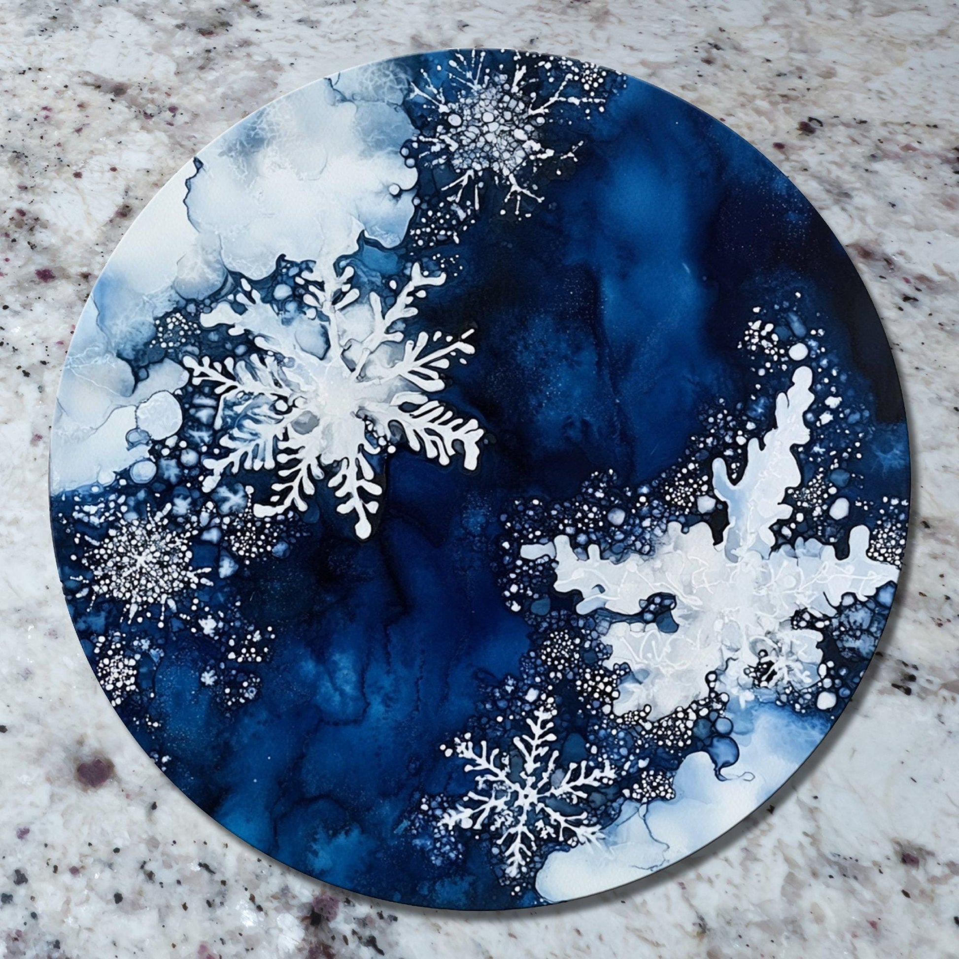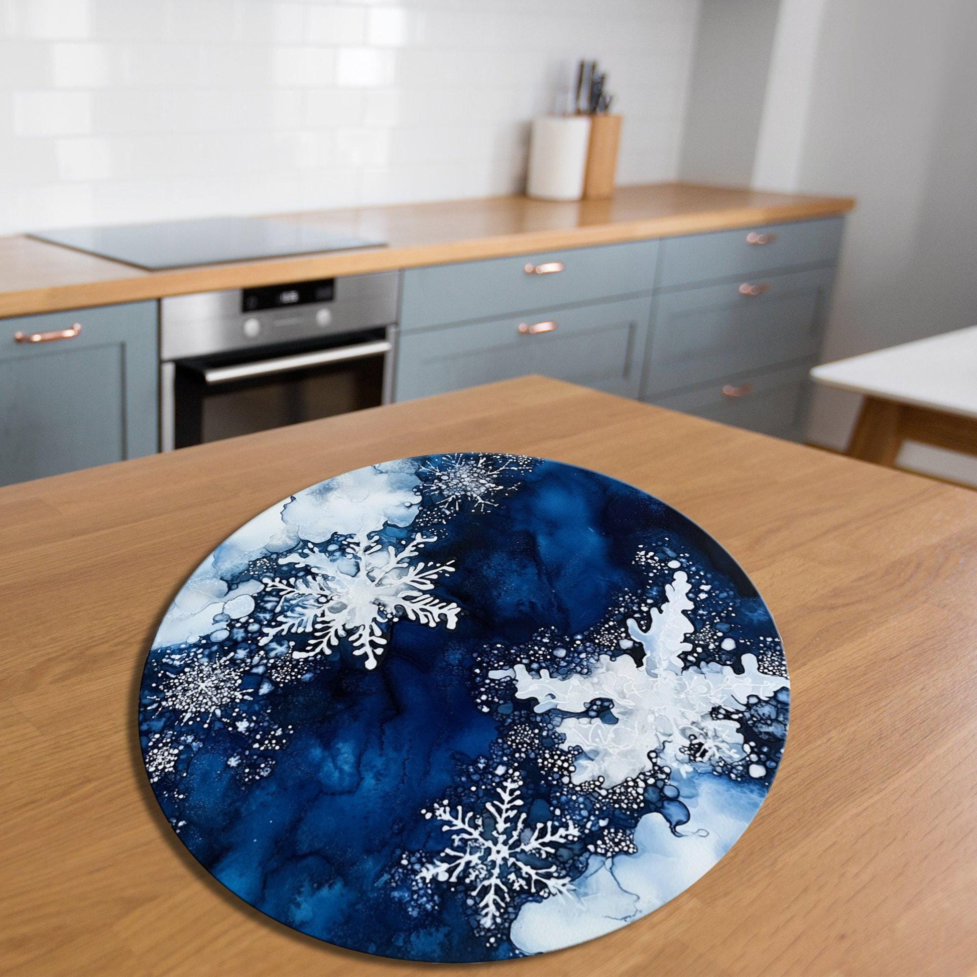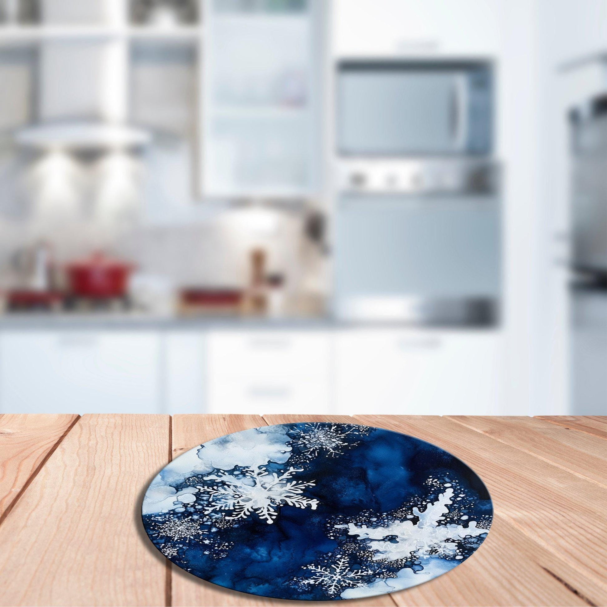 Snowflakes on Deep Blue Glass Cutting Board 8-inch Round Trivet Charcuterie Board Gift for Her Mom Kitchen Decor