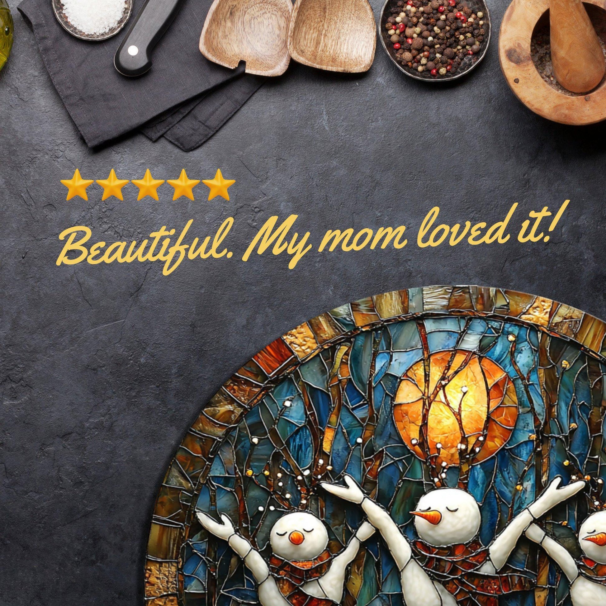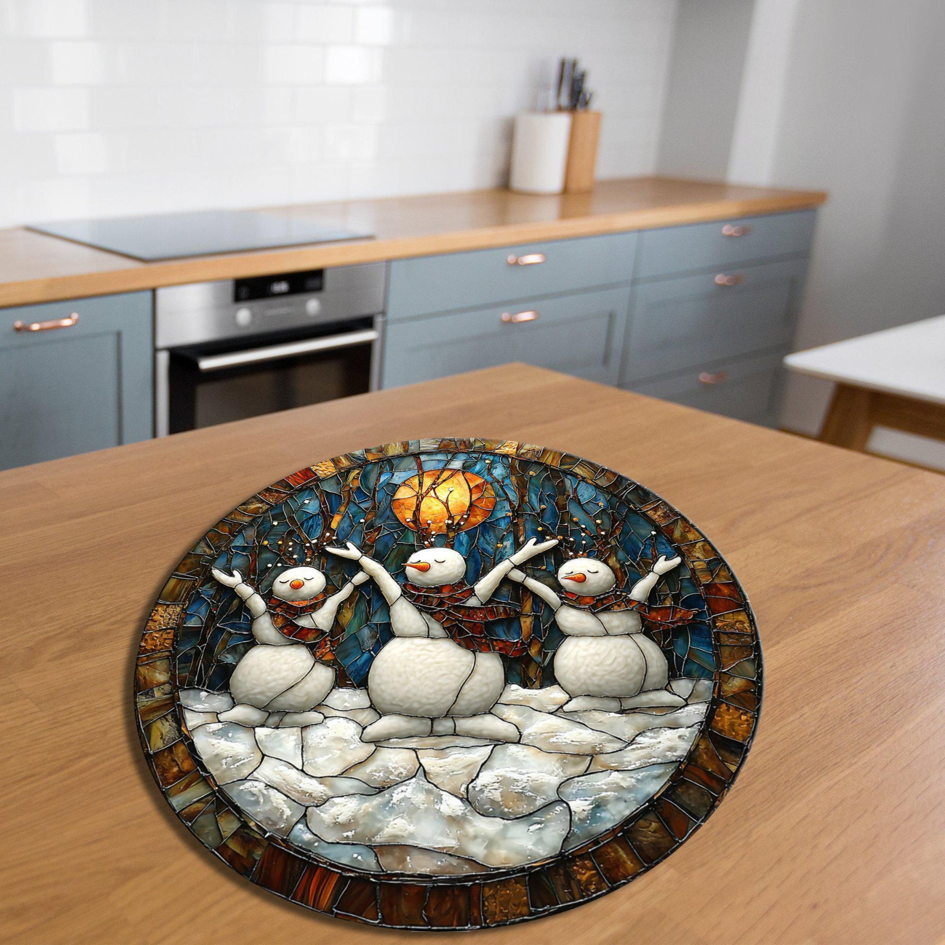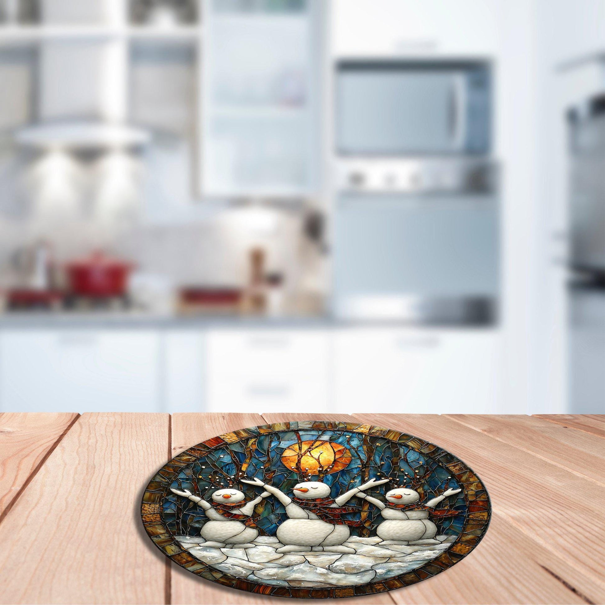 Snowman Yoga Class Glass Cutting Board 8-inch Round Trivet Charcuterie Board Gift for Her Mom Kitchen Decor