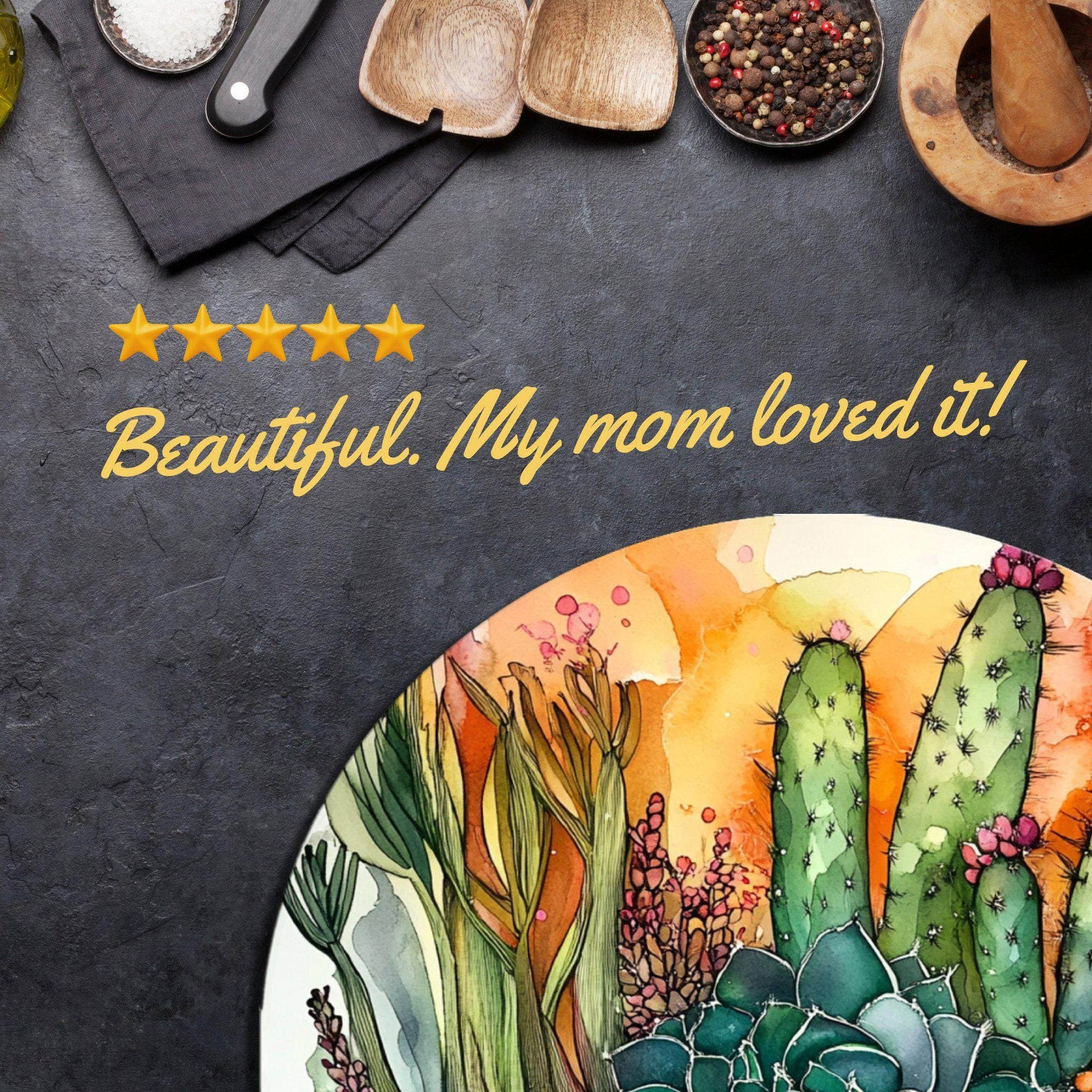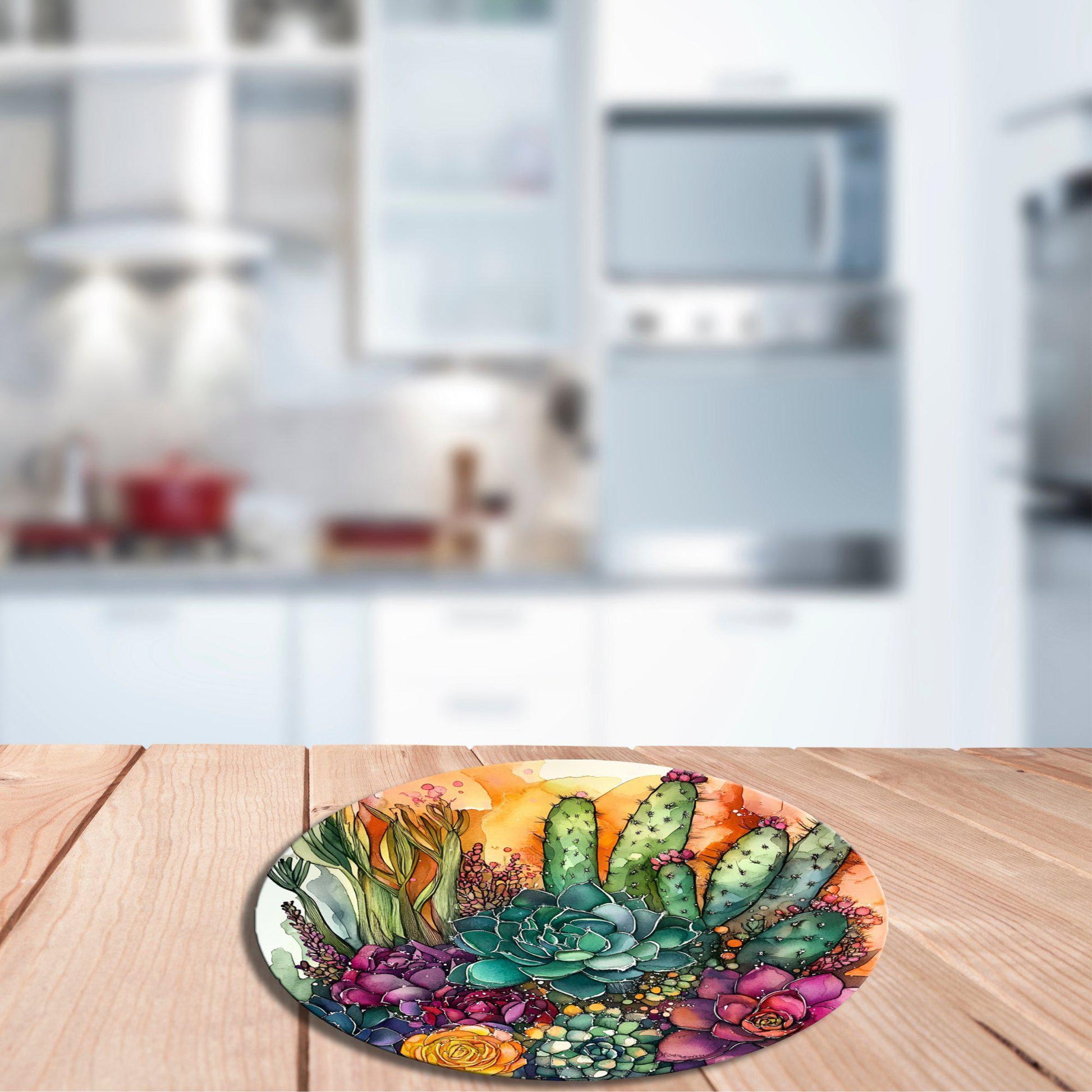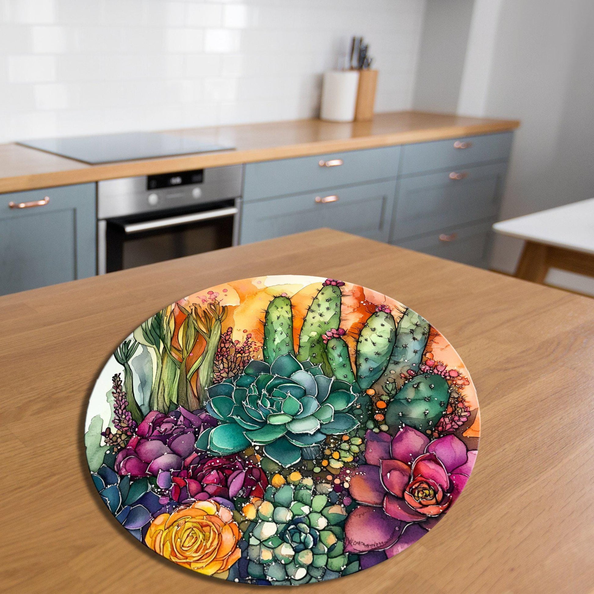 Succulents and Cacti Glass Cutting Board 8-inch Round Trivet Charcuterie Board Gift for Her Mom Kitchen Decor